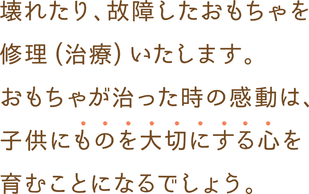 壊れてしまったけれど捨てられない、あなたの大切なおもちゃを、我々おもちゃドクターに託してみませんか?